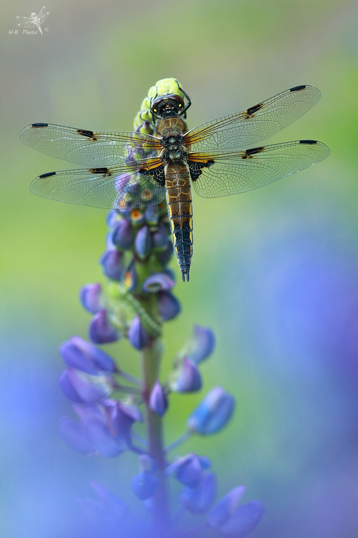 Vážka čtyřskvrnná, samička, spící, přeparkovaná na lupiny kolem lomu